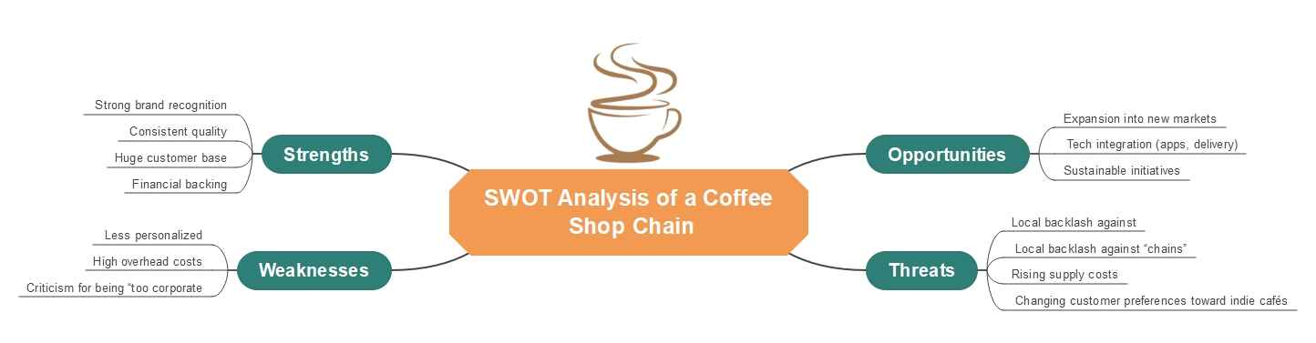 Not all coffee shops are the same; each type has its own vibe and business model. That’s why a SWOT analysis will differ depending on the type of coffee shop. Let’s explore the SWOT analyses of a few business models. These examples are created in EdrawMind, and you can download the templates to customize them for your own business.